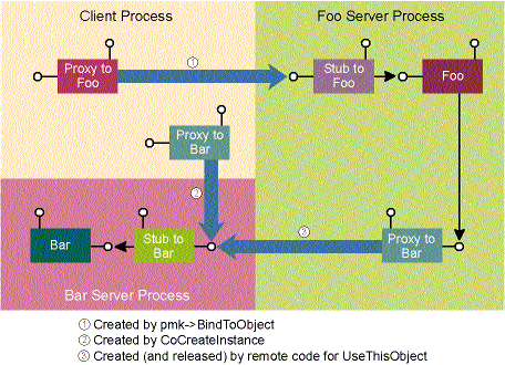 As shown in Figure 2, the client passes a pointer to an inproc object (pbar) as a method parameter to a remote object (pfoo). This causes the COM remoting layer to build a stub in the client's process to receive packets from the proxy created in the remote object's process for the duration of the UseThisObject method call. This is required to allow the inproc object to receive calls from the remote object. If the remote object does not AddRef the proxy it receives as the [in] parameter to UseThisObject, all is well because the stub routine for UseThisObject will automatically release the proxy to pbar, tearing down the Bar stub once the method call has completed. If, on the other hand, the remote object were to AddRef the Bar proxy it received in UseThisObject, the client process should remain running as long as the proxy is outstanding. Unfortunately, there is no generic mechanism for the inproc object to communicate its lifetime to the client. Because of this, the client is apt to shut down prematurely, leaving the remote object with a dangling proxy. While the remote object will not crash, it will receive an HRESULT from the next method call indicating that the client-side object has gone away.