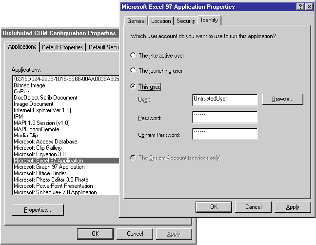 This security problem is often addressed by using code signing and authentication, which works great when the code you want to use is signed by an authority that you trust. However, there may be unsigned code that you really want to experiment with and yet keep it from accessing critical resources without detection. As is shown in Figure 4, if the server is implemented as an outofproc server, you can easily use DCOMCNFG.EXE to configure the server to run as a distinguished security principal. For untrusted code, you could create a new user account (such as UntrustedGuest) and give it virtually no permissions on the system. Additionally, you could configure the system to create audit entries in the security event log whenever the object accesses system resources. For security-sensitive users, this is a critical requirement.