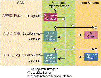 When implementing a surrogate, you do not want to load and register the inproc class object directly. Instead, the surrogate must create a new surrogate-defined class object wrapper that exposes IUnknown, IClassFactory, and (optionally) IMarshal. This wrapper class must be registered with COM using CoRegisterClassObject: