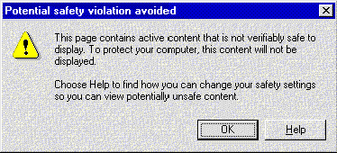 These behaviors are due to the Internet Explorer security mechanisms for ActiveX controls. The ActiveX controls you can automatically download over the Internet can do anything—including things that would damage your system. Java attempts to solve this problem by severely limiting what a Java™ applet can do. It can't, for instance, access the client computer's file system. ActiveX controls take a different approach: they demand positive identification of the author of the control, verify that the control hasn't been modified since it was signed, and identify safe controls—kind of like shrink-wrapping a control for download over the Internet. Because of this approach, ActiveX controls can use the full power of the client's system safely.