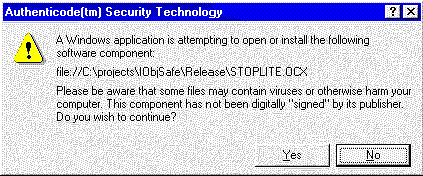 If a user attempts to load a Web page that uses a control not already registered on the user's system, Internet Explorer will download the control. But before it does, the browser checks to see if the control has been digitally signed. If not, and security is set to high, the dialog box in Figure 1 appears.