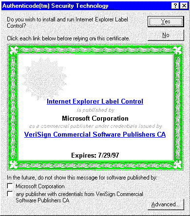 Note the checkboxes at the bottom. When the user checks either box, controls signed by those sources will download with no further interruption. (For software published by individual developers, only the first checkbox is available with Internet Explorer 3.01.)